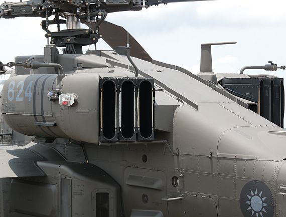 (上與下)台灣陸軍AH-64E的四聯裝地獄火反戰車飛彈發射器,照片裝每組只掛載四枚。 攝於2014年7月19日台中清泉崗空軍基地。