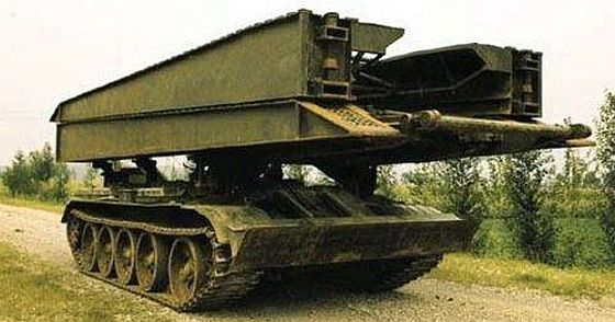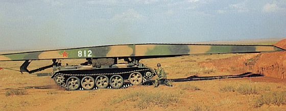 WZ-621架橋車橋材完全伸展。 產品型號WZ-621,以79式的底盤為基礎,加裝一套全長18m、承載重量40噸的水平伸展橋材,橋的收放仰賴液壓作業,能在45秒內完成架橋作業。 88式雙聯裝57mm防空機砲
