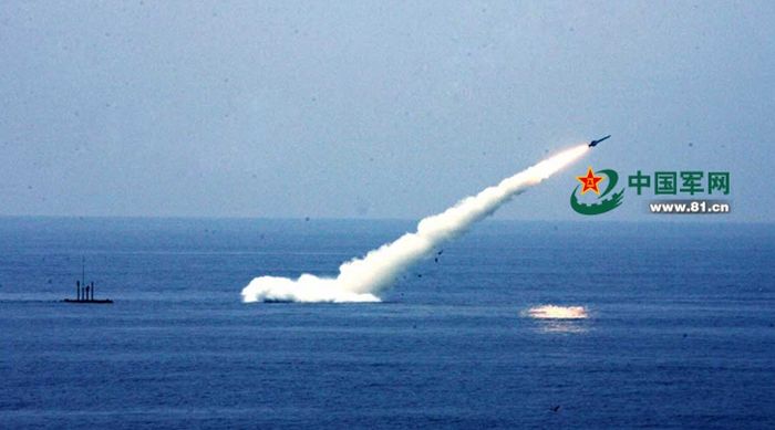一艘中國Kilo潛艇發射反艦飛彈的畫面,注意畫面左側潛艇圍殼頂部露出水面。