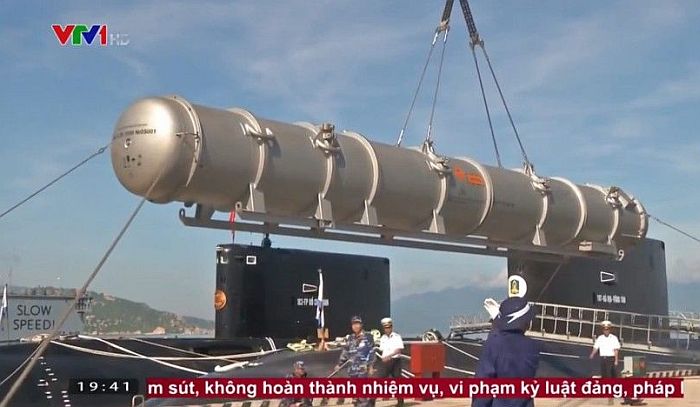 (上與下)在2017年12月22日,越南國家電視台第一頻道播出越南海軍Kilo 636MV柴電潛艇首次發射3M54E俱樂部反艦導彈