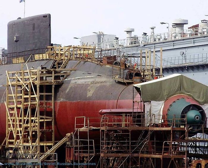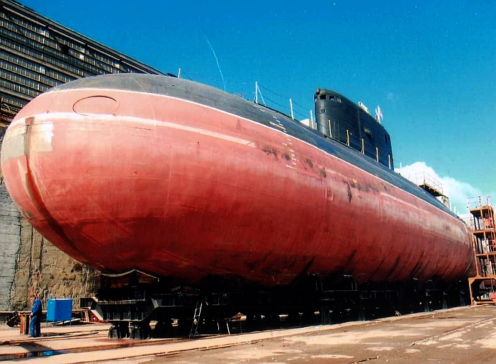 一艘維修中的Kilo潛艦,艦首非耐壓殼被卸下,可以看到前方MGK-400聲納的圓柱陣列,後方則是耐壓殼前端。