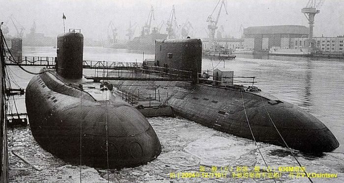 兩艘中國的Kilo 636在俄羅斯聖彼得堡Admiralteyskie verfi船廠海試階段的照片,攝於2004年12月10日。