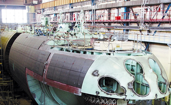 建造中的Kilo潛艦,可以看到前部魚雷發射管部位;艦首下方的聲納陣列已經安裝。後部分段尚未與前部分段合籠。