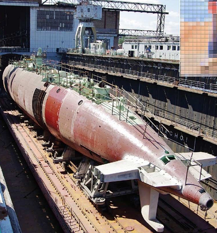 (上與下)一艘在乾塢中的Kilo潛艦。