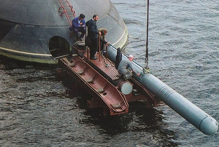 一艘Kilo潛艦正在裝填53K-65KE反艦魚雷。不同於西方潛艦通過逃生艙口