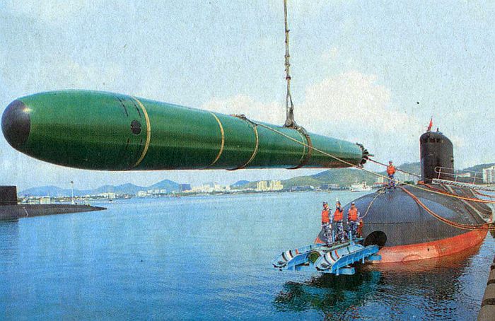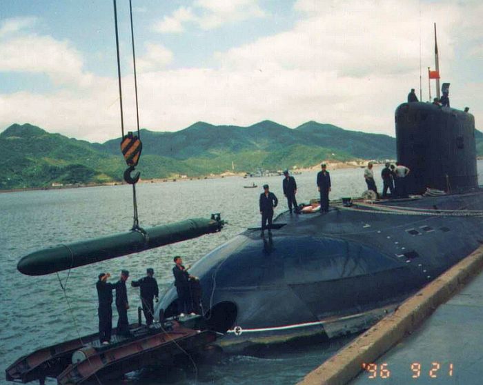 一艘中國的Kilo潛艦正在裝填魚雷。