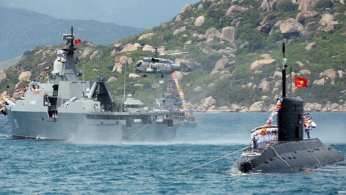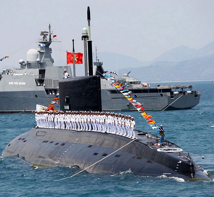 (上與下)2015年5月7日越南海軍節閱艦式上的Kilo 636MV潛艦,前方同樣是越南購自俄羅斯