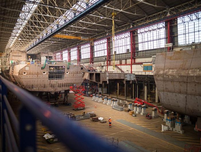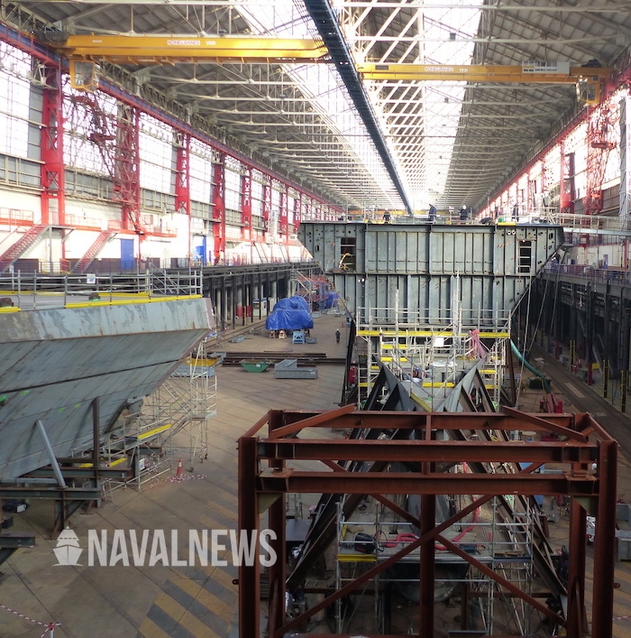 兩艘正在DCNS洛里昂船廠產線建造中的FREMM,分別是該廠建造的第七艘(Bretagne D655,左)與