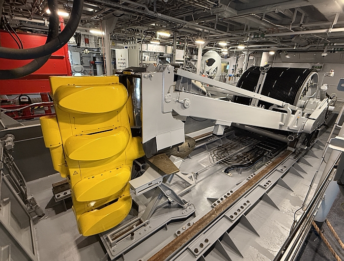 意大利第九艘FREMM巡防艦Spartaco Schergat(F598)艦尾艙內的CAPTAS 4主動拖曳陣列聲納的絞車與拖曳體。