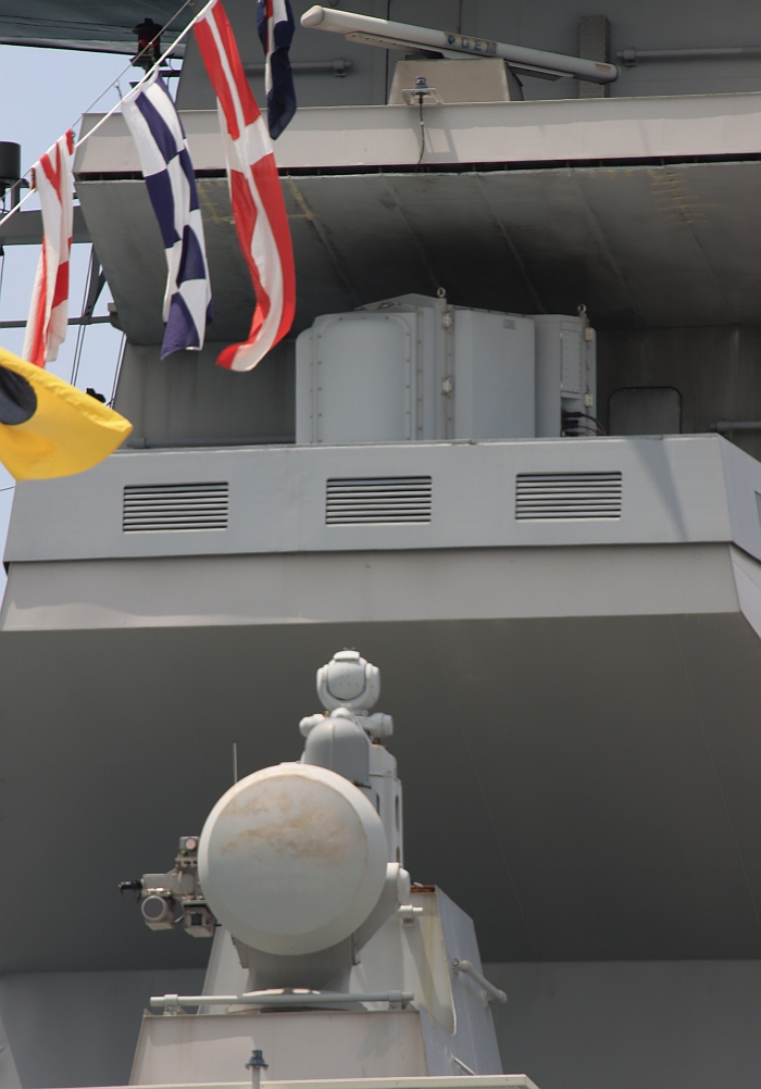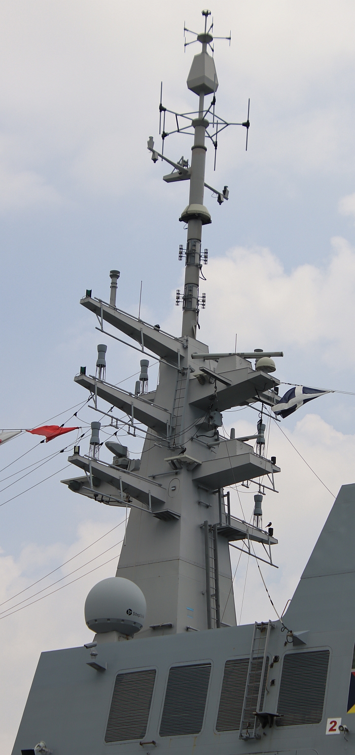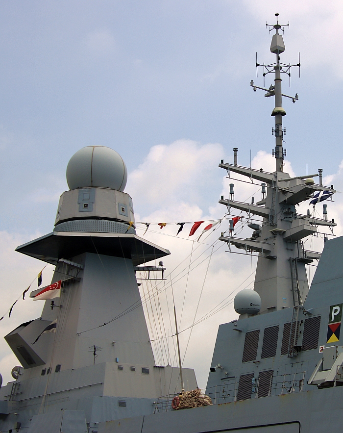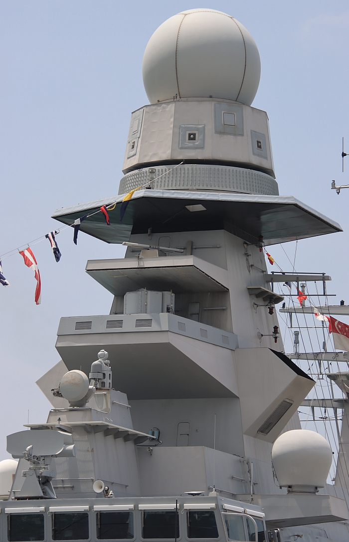 此外,艦橋側面裝有Selex SHF TSN-101 X衛星頻通信系統的天線。攝於2025年5月7日 新家坡國際海事防務展