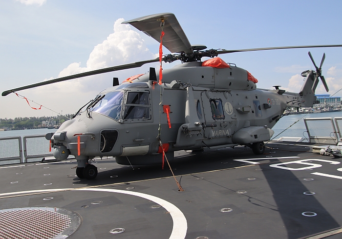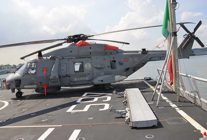 (上與下)意大利FREMM通用型巡防艦Antonio Marceglia (F597)艦尾直昇機起降甲板上的SH-90