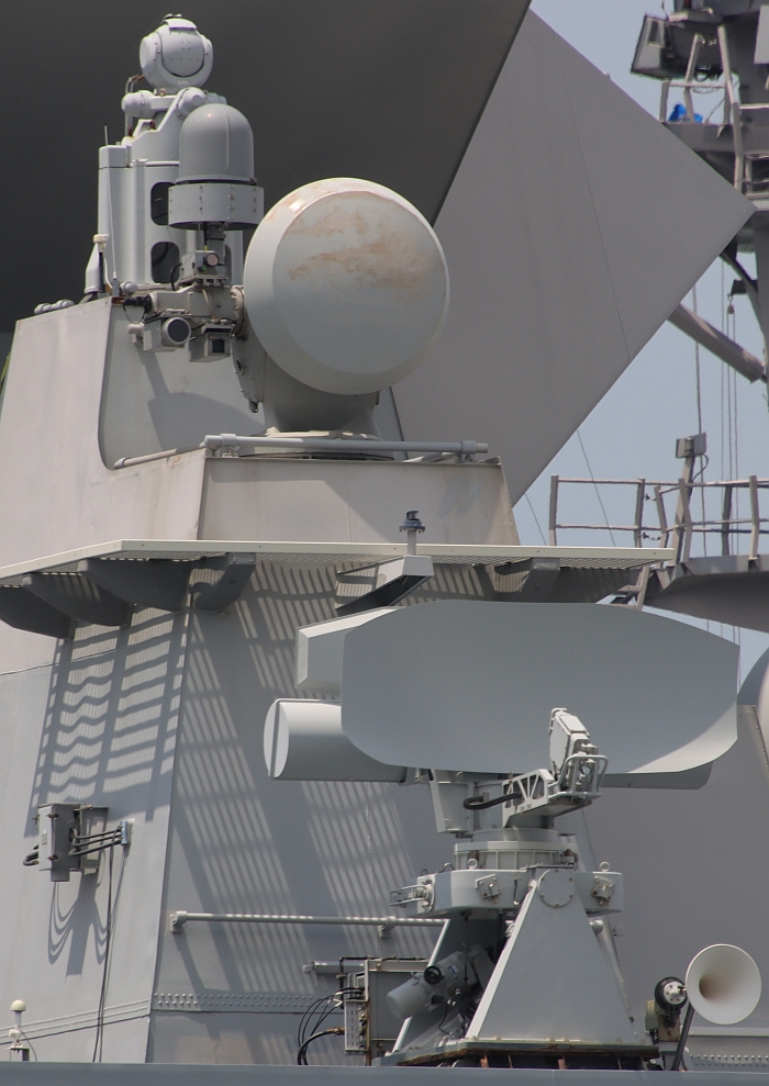 標定系統 與一具NA-25X DARDO-F光電/雷達 火砲射控系統(前),艦橋頂上有一具RAN-30 X頻多功能雷達。