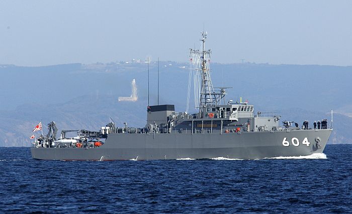 江之島級掃海艇首艇江之島號(MSC-604)。江之島級是平島級的後繼型,以強化玻璃纖維材料取代木質船體。
