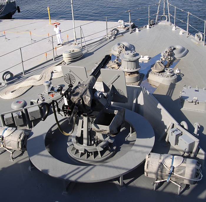 江之島級掃海艇二號艦父島號(MSC-605)的艦首JM-61人力操作20mm火神砲。攝於2023年10月14日橫須賀基地。