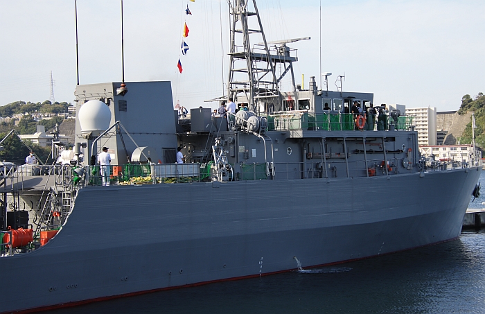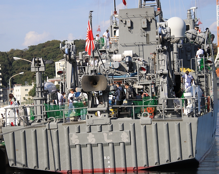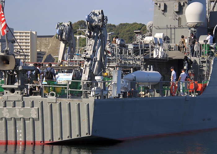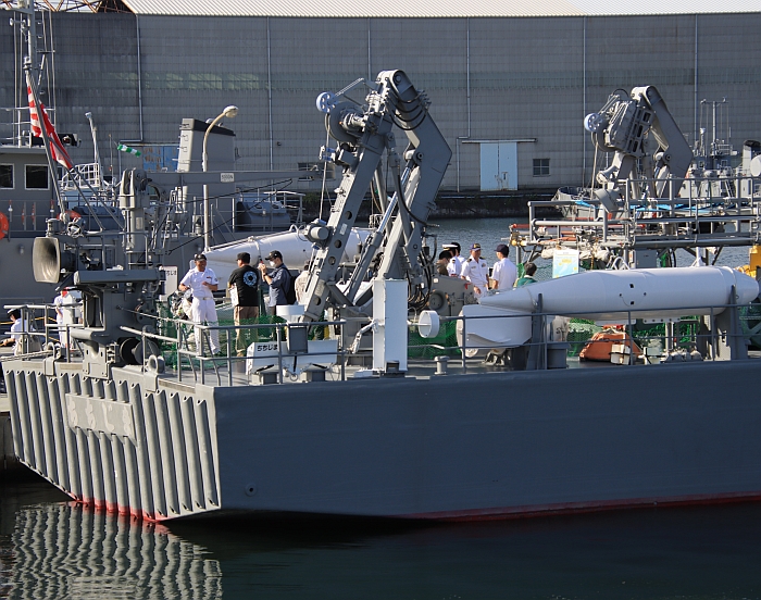 江之島級掃海艇二號艦父島號(MSC-605)的艦體中部,可以看到左舷搭載S-10遙控獵雷載具,