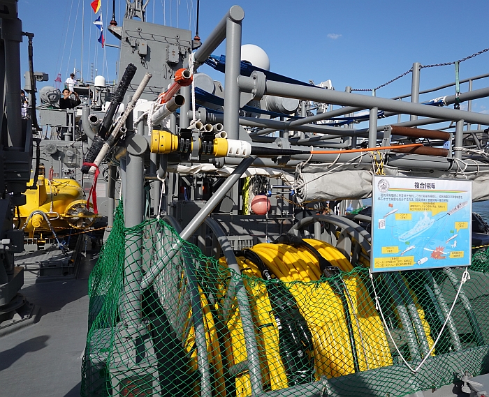 江之島級掃海艇二號艦父島號(MSC-605)的後甲板,左舷搭載了S-10遙控獵雷載具。
