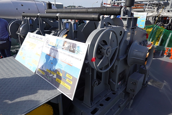 江之島級掃海艇二號艦父島號(MSC-605)艦體後部甲板的絞車,用來收容磁性感應掃海具(黃色)。