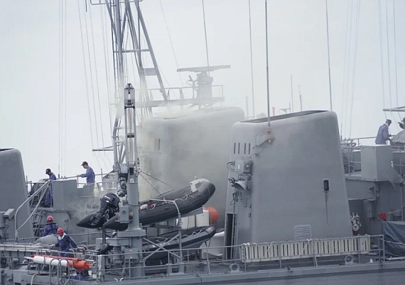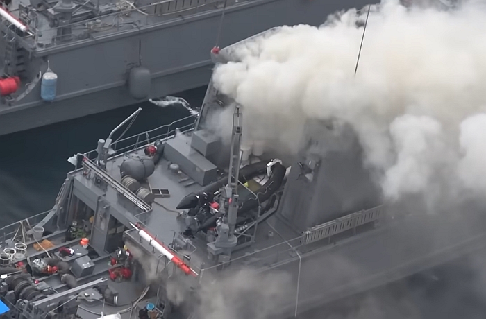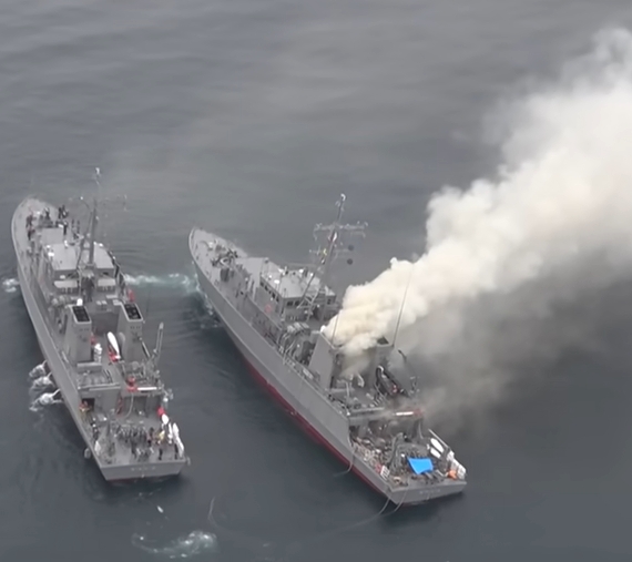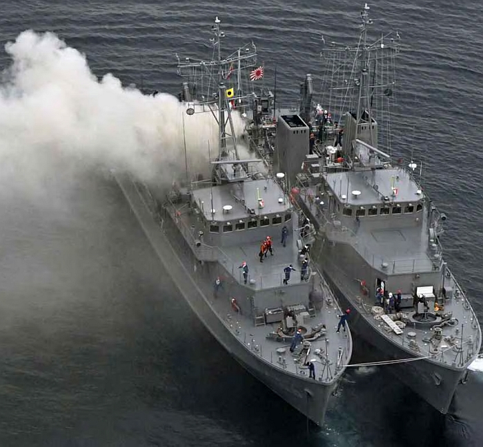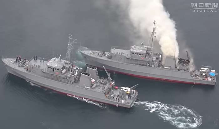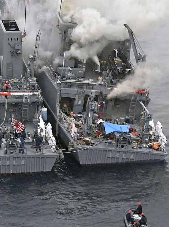 ,海上自衛隊派出姊妹艇豐島號(MSC-685,右)正傍靠該艦協助救援。火勢在下午逐漸失去