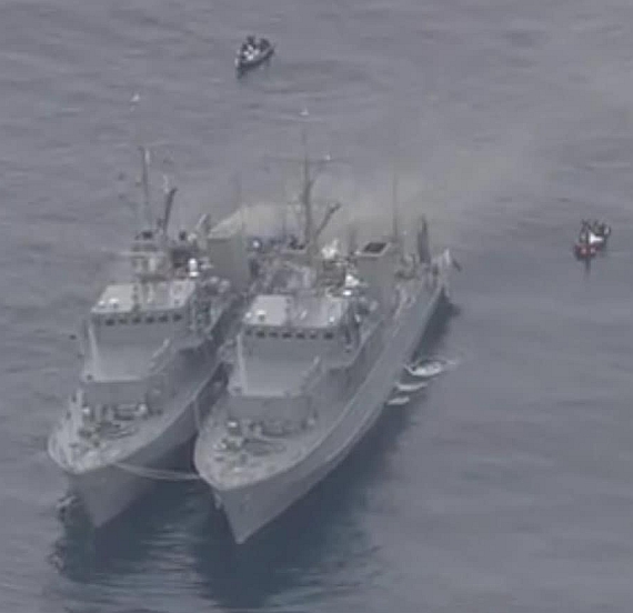 11月10日下午4時以後,宇久島號的人員都已經轉移到豐島號(左),此時 豐島號正在遠離久島號,繼續從安全距離救災。