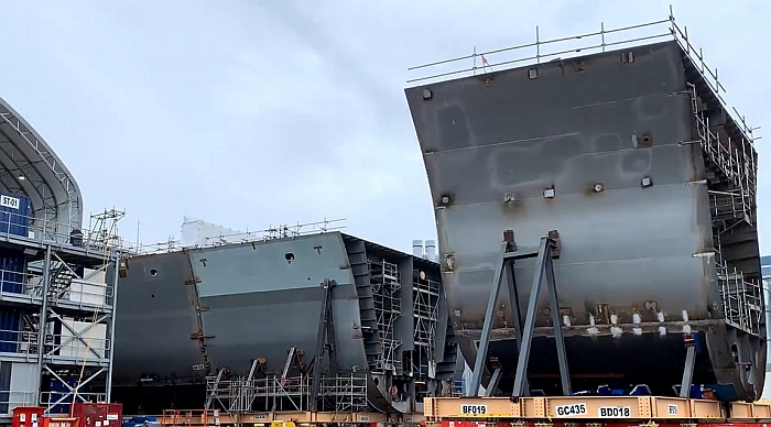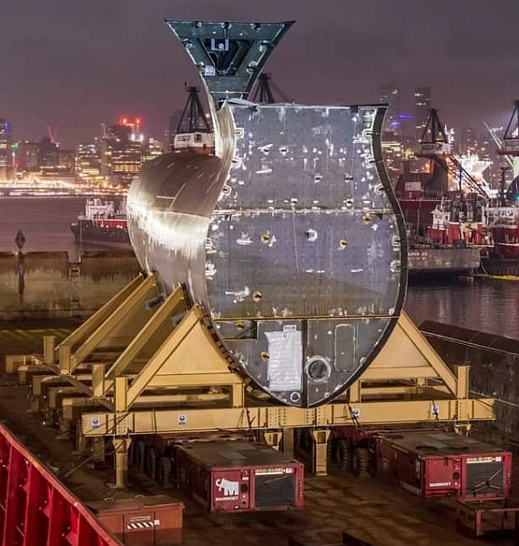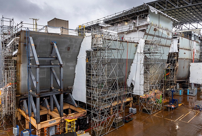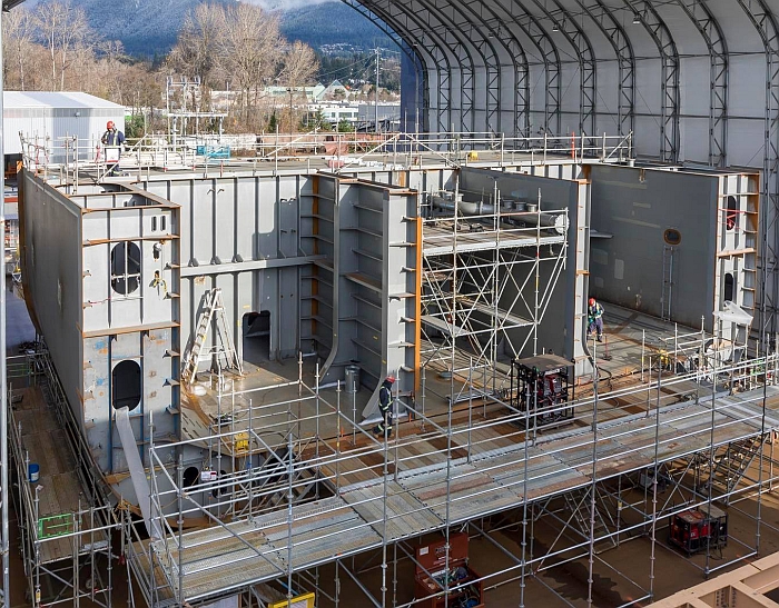 在溫哥華船塢組裝中的保護者分段,攝於2021年2月初;此時全艦約有90%的分段已開始製造。