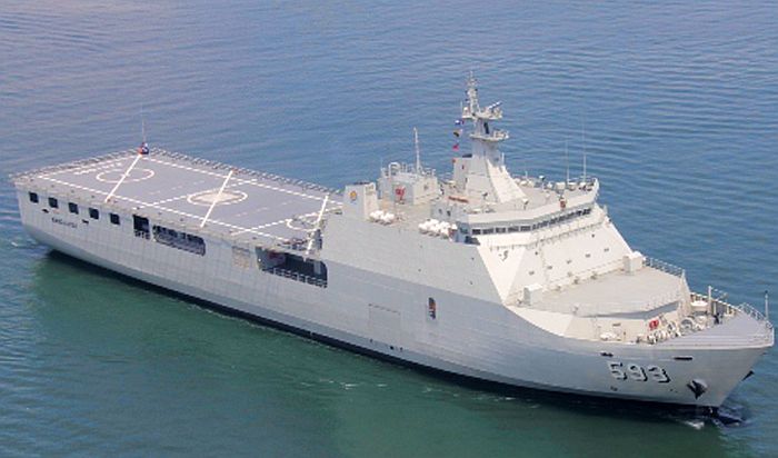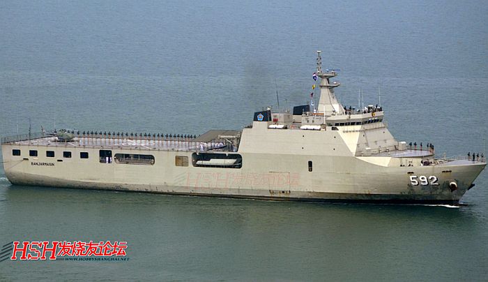 第二批馬卡薩級的Banda Aceh(LPD-593)。注意艦首並未實際加裝100mm快砲,但預留的砲位。