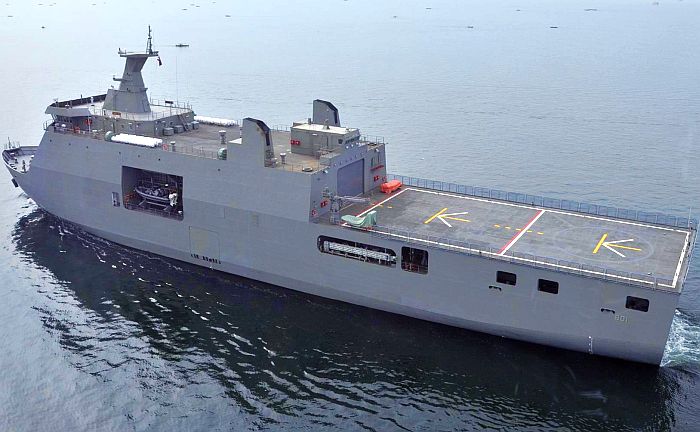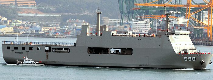印尼向韓國訂購的四艘馬卡薩級兩棲船塢運輸艦首艦馬卡薩號(KRI Makassar LPD-590),由大宇重工製造。