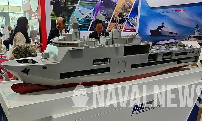 PT PAL在2023年阿布達比國際海事防務展(NAVDEX 2023)展出的馬薩卡衍生型多功能船塢運輸艦;
