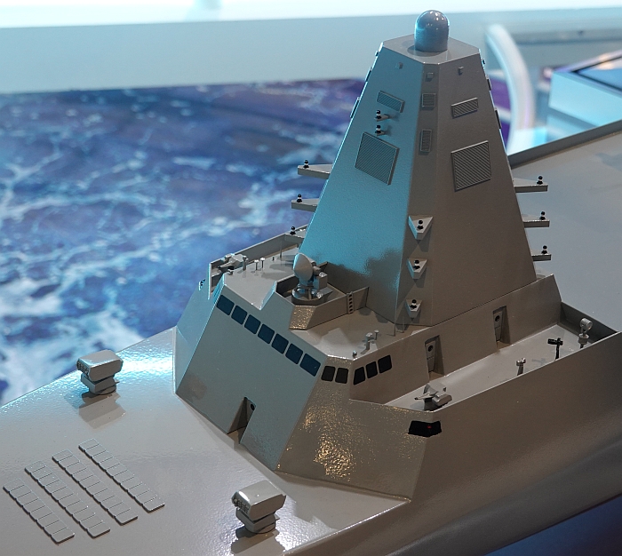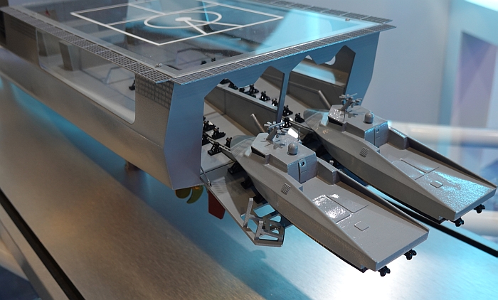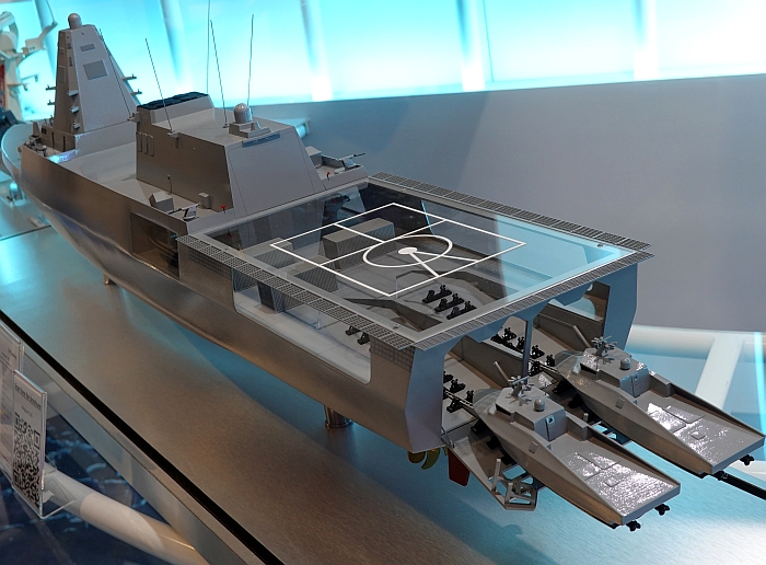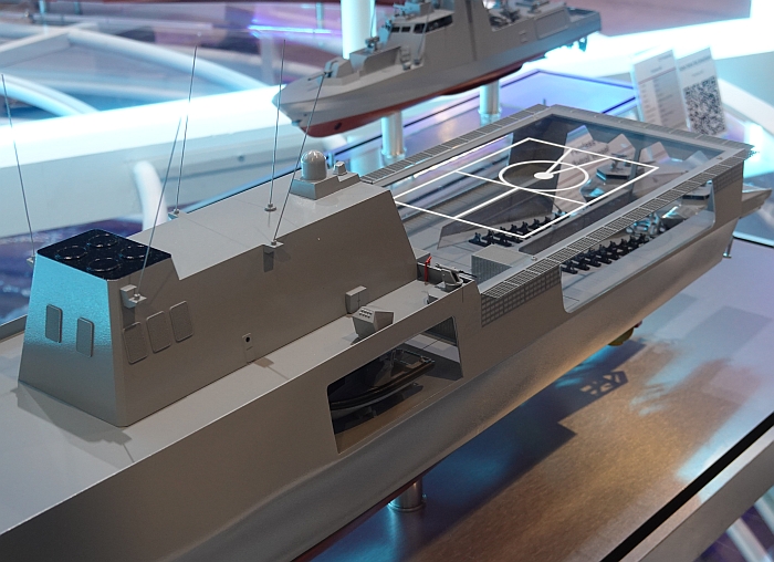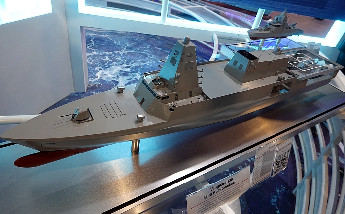 展出的Vanguard 130型MRCV設計方案模型。艦上裝備中口徑主砲、垂直發射系統、小口徑火砲、