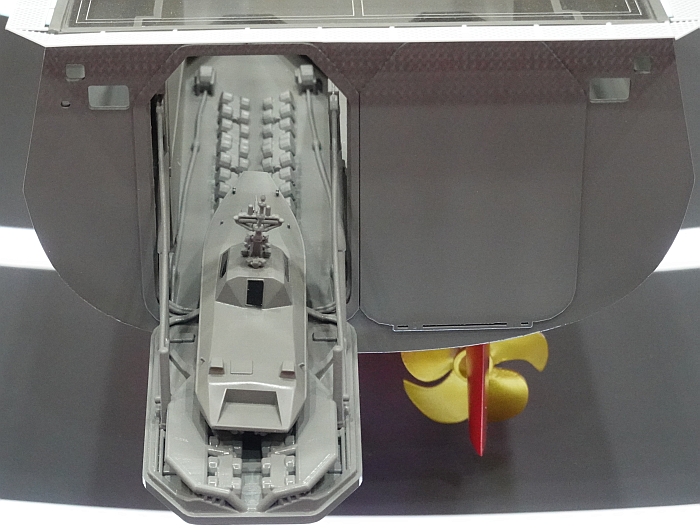水下載具以及其他集裝箱模組;艦尾有兩個坡板式小艇收容艙,可收放有人或無人水面載具。