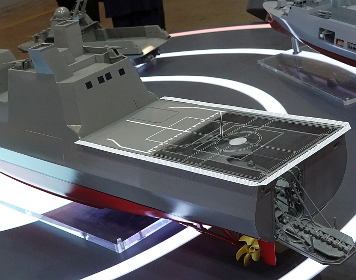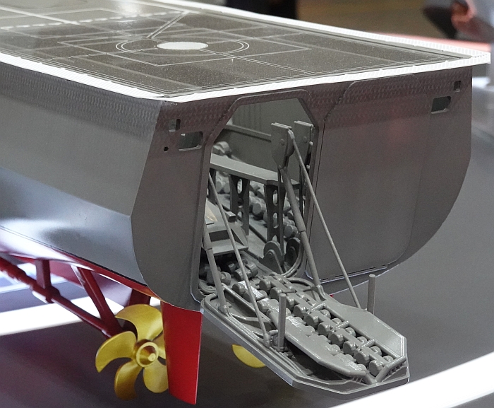 新家坡工程集團(ST Engineering)在2025年5月新家坡國際海事防務展(IMDEX 2025) 展出的MRCV模型艦尾。艦尾有兩個坡板艙門,可讓小艇進出。直昇機甲板上有兩個起降點, 並且設有一個升降機直通下方任務艙甲板。