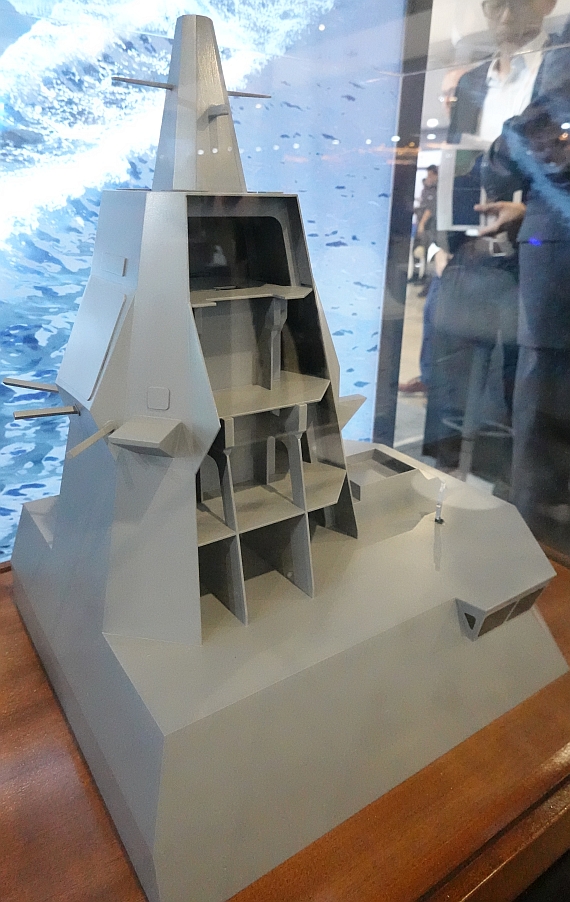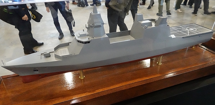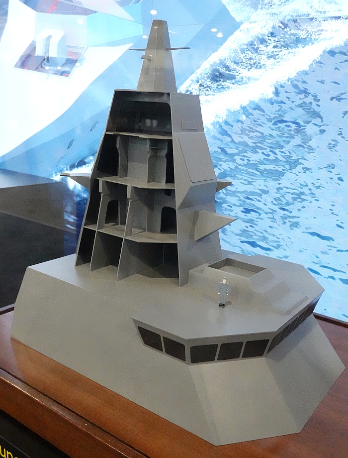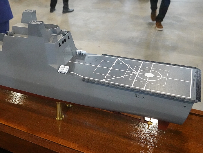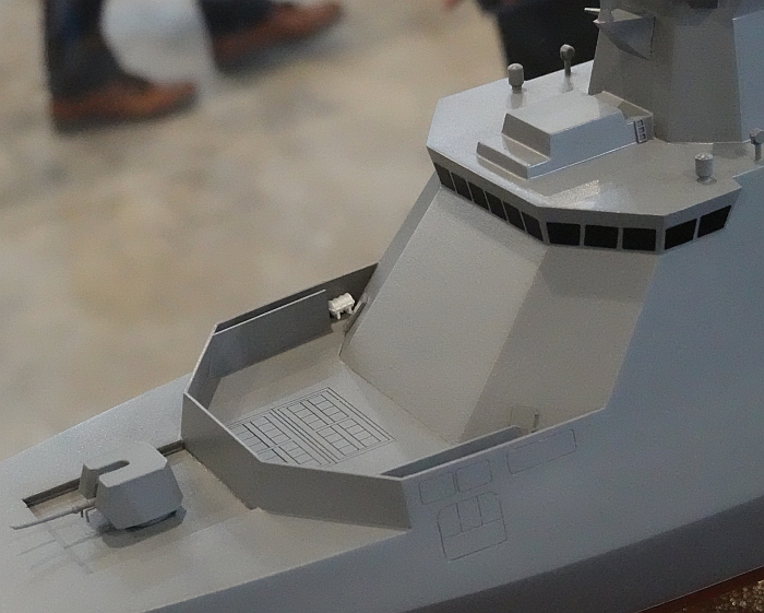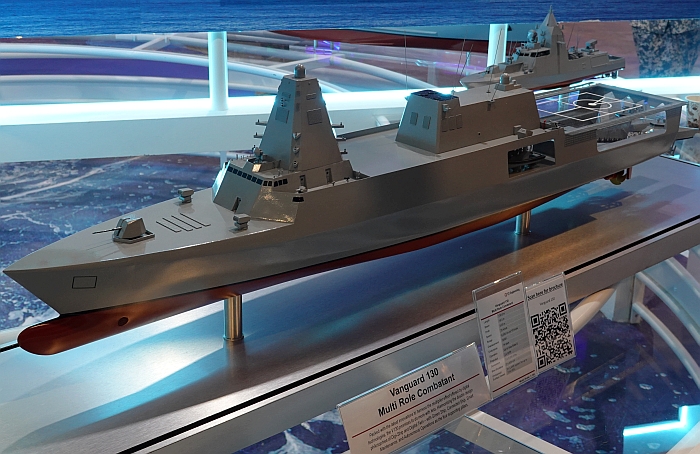 展出的Vanguard 130型MRCV設計方案模型。艦上裝備中口徑主砲、垂直發射系統、小口徑火砲、