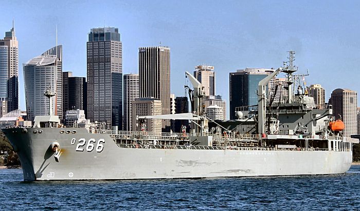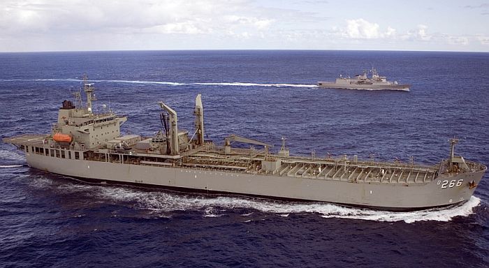 正為一艘紐澳軍團級巡防艦並排航行的皇家澳洲海軍天狼星號(HMAS Sirius O-266)艦隊油船。