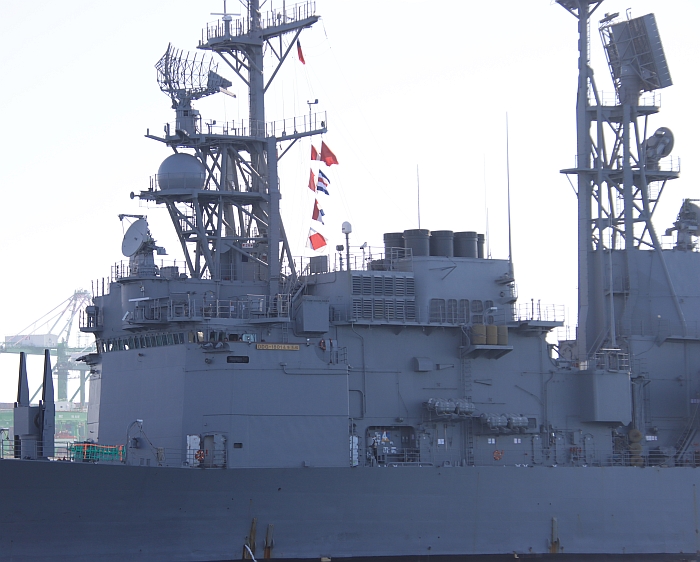基隆號尾艛頂部近照,可以看到MK-15 Block 0方陣近迫武器系統、SLQ-32(V)3電戰系統的接收天線組。