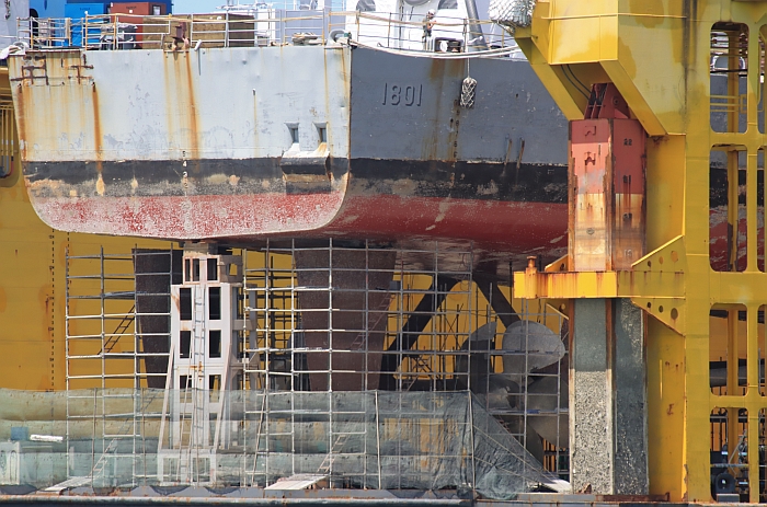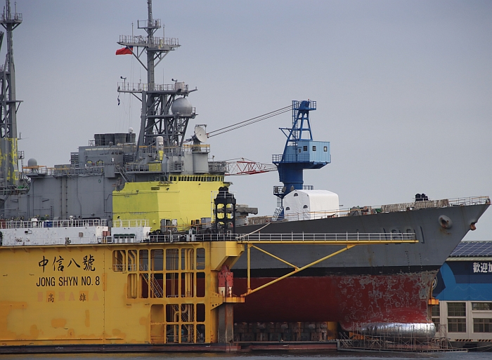 (上與下二張)在高雄中信造船廠浮動乾塢進行維護作業的基隆號(DDG-1801),注意艦尾的