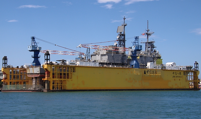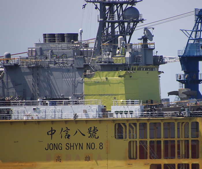 在高雄中信造船廠浮動乾塢進行維護作業的基隆號(DDG-1801),前部船樓漆上黃色底漆。