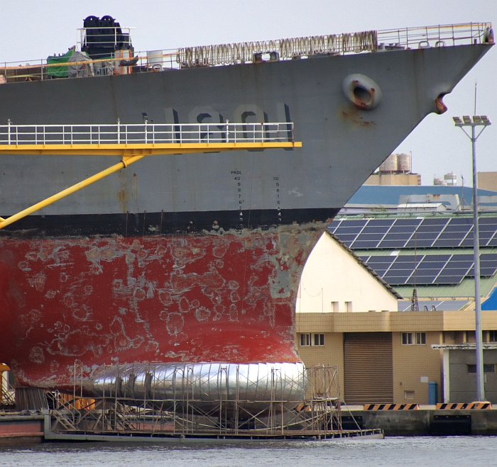 在高雄中信造船廠浮動乾塢進行維護作業的基隆號(DDG-1801),注意艦首下方AN/SQS-53D