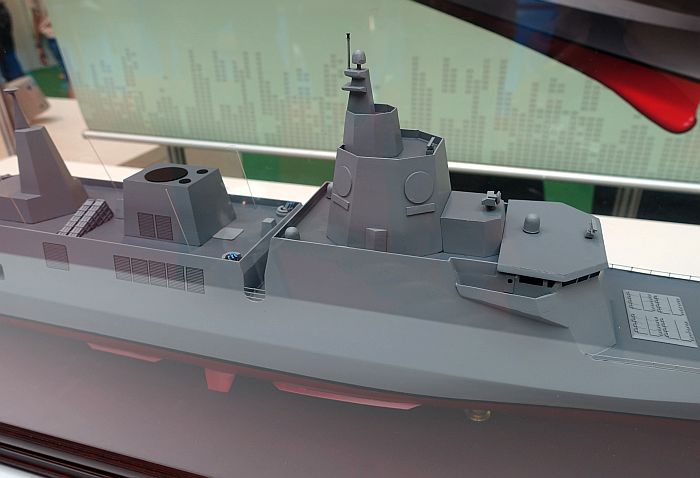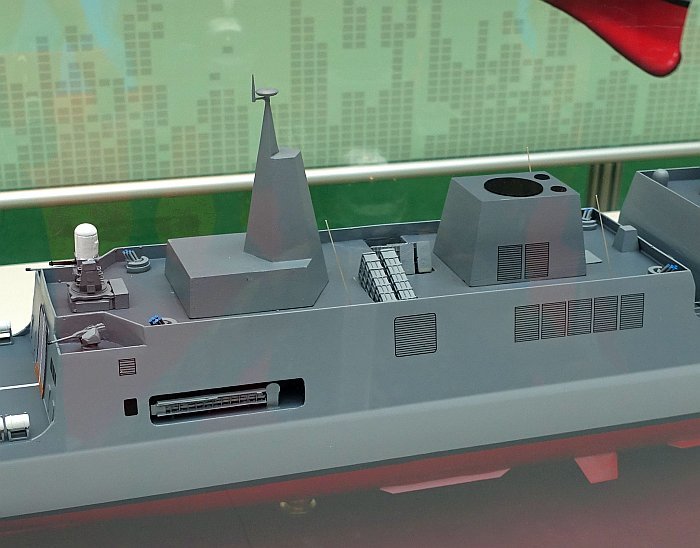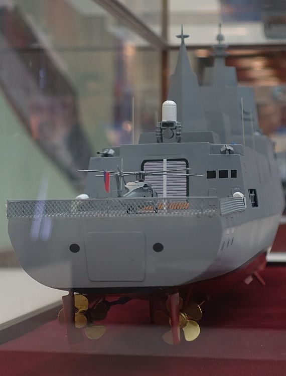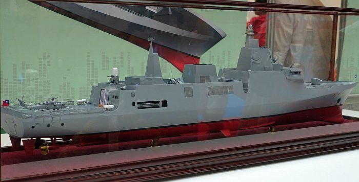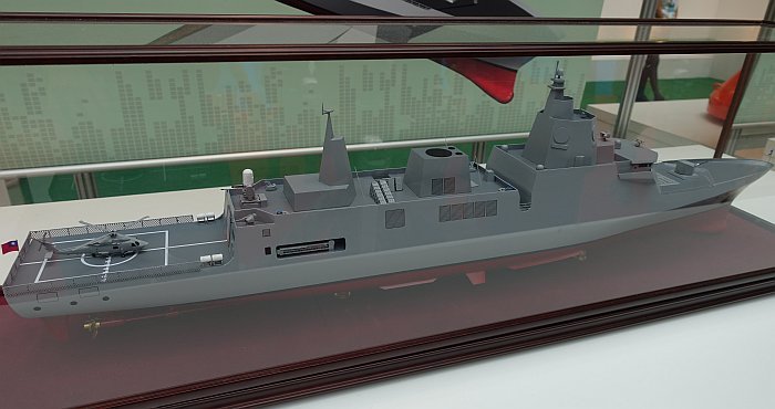 (上與下)2017年8月18日世貿航太國防展中展出的「新一代飛彈巡防艦」模型正面與後面
