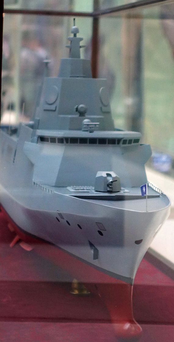 (上與下三張)在2017年8月16日世貿航太國防展中首度展出的「新一代飛彈巡防艦」(震海計畫)模型,艦上裝備