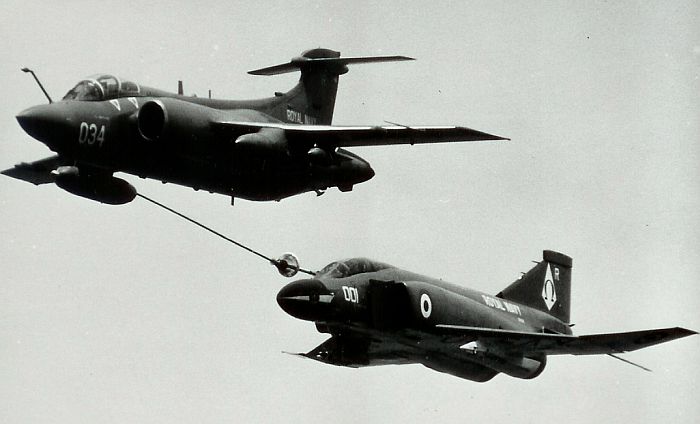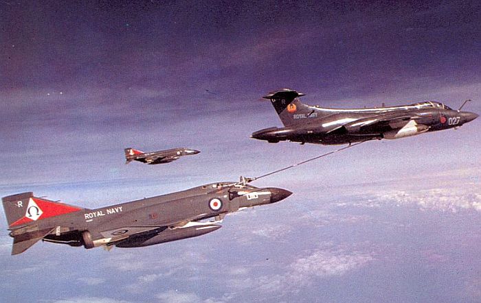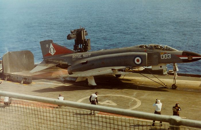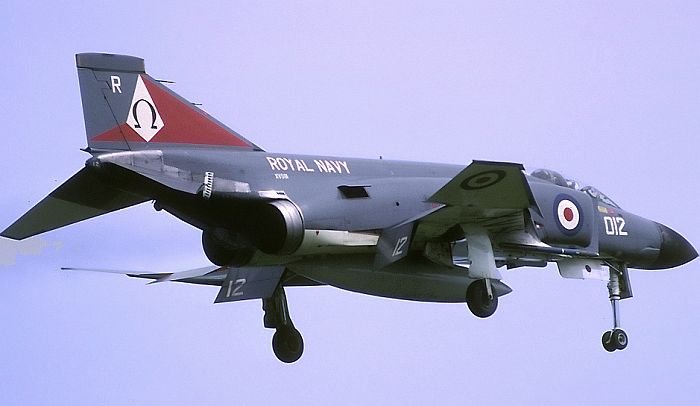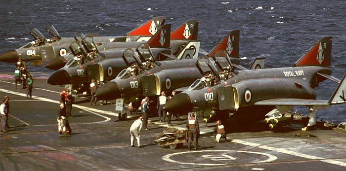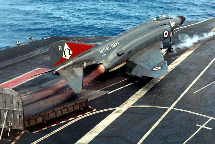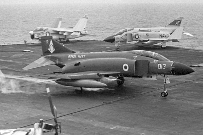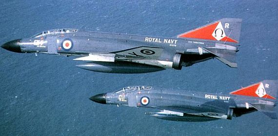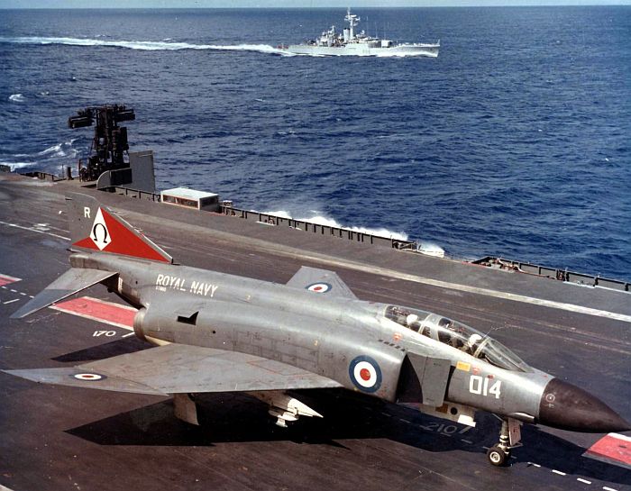 兩架編隊飛行的皇家海軍FG.1幽靈式。 FG.1幽靈式(Phantom):即美國麥克唐納.道格拉斯(McDonnell Douglas)的F-4幽靈式戰鬥機的英國版。在1965年2月,工黨政府取消了原本打算作為皇家海/空軍通用機種的霍克西利(Hawker Siddeley)P.1154超音速垂直/短場起降(VSTOL)戰鬥機,改從美國引進F-4C戰鬥機供海、空軍使用 。P.1154是霍克西利研製的P.1127次音速VSTOL戰機的超音速版,但其實皇家海軍並不情願採用P.1154,因為英國政府可能逼迫海軍放棄傳統起降航空母艦而屈就排水量與航空能力低得多的輕型短場起降航母;而皇家空軍也不願意採用P.1154,而希望採用航程與籌載量更高的超音速戰鬥轟炸機。由於P.1154的超音速版飛馬座發動機的研製成本節節攀高,工黨政府只好取消開發,改為皇家海/空軍選擇美製F-4。 為了彌補英國國防工業在一連串刪減政策中的損失,英國特別要求英國版幽靈式必須搭載勞斯萊斯.史佩的RB-168-25R Mk.202/203渦輪噴射發動機,總計機上40~45%的部件(包含雷達)需授權英國廠商生產。RB-168-25R Mk.202/203的推力比原本的J-79渦輪發動機更大,為此英國版幽靈式加大了進氣口,機身後段也進行修改。 此種英國版幽靈式的皇家海軍版本編號FG.1(美方編號為F-4K),皇家空軍版為FG.2(美 方編號為F-4M)。 此外,由於皇家海軍航空母艦的飛行甲板和彈射器短於美國航空母艦,FG.1在航空母艦甲板上準備起飛前,機鼻起落架會進一步抬高40吋,使其彈射時有更大的攻角與升力,不過這也使FG.1有更多發動機噴流朝下噴向飛行甲板,這使得搭載的皇家方舟號航空母艦改裝時,甲板必須採取更多防護措施。 皇家海軍最初預計購買120架FG.1來裝備鷹號、皇家方舟號以及規劃中的CVA 01艦隊航空母艦,隨後由於CVA 01取消以及縮減機隊規模,因此採購數量大幅降至48架,皇家方舟號與鷹號各裝備一個中隊 。在1968年1月16日,工黨政府正式決定在1972年將皇家海軍所有航空母艦退出現役,並取消皇家空軍購買美國F-111K的計畫,然後等皇家海軍航空母艦除役後,將幽靈式與加勒比海盜式機隊轉移給皇家空軍 。配合這項政策,原本皇家海軍改裝鷹號航空母艦來操作幽靈式的計畫一併遭到否決, 只剩下當時仍在進行大規模改裝工程的皇家方舟號可以裝備幽靈式。由於這項變更,皇家海軍訂購的48架幽靈式中僅29架撥給皇家海軍航空隊來配屬皇家方舟號,其餘則移交皇家空軍。皇家海軍這29架幽靈式部署於海軍航空第892中隊(892 Naval Air Squadron)。而皇家空軍最初打算採購200架FG.2,但由於預算刪減而只獲得118架。在1978年 皇家方舟號除役,海軍航空第892中隊隨之解散,剩餘的FG.1統一移交給皇家空軍。FG.2為皇家空軍服役到1992年才完全除役,被龍捲風(Tornado )F3戰鬥轟炸機取代。 幽靈式機體長19.2m,翼展11.7m,機高5m,空重13757kg,籌載重量18.825kg,最大起飛重量28030kg,飛行高度12190m時最大飛行速率約2.23馬賀(約2370km/hr),巡航速率940km/hr,作戰半徑680km,轉場部署航程1403km(裝備三具副油箱),升限18300m,爬升率210m/s。機上可攜帶8480kg的武器籌載。