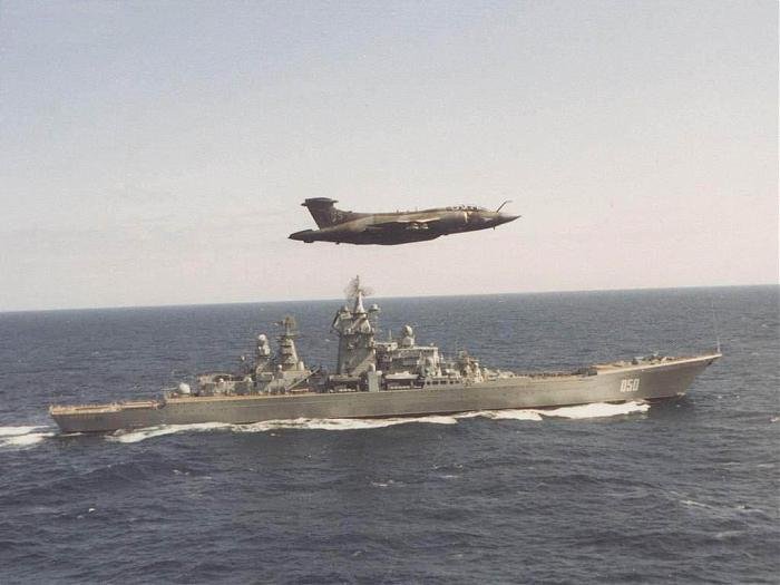 一架加勒比海盜式低空飛過一艘蘇聯基洛夫級(Kirov class)核子動力飛彈巡洋艦。