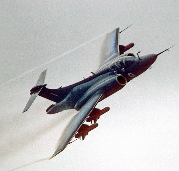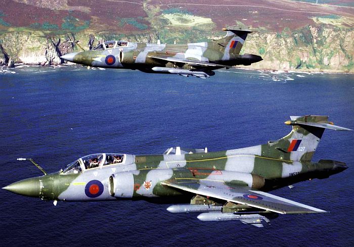 由於Gyron Junior發動機推力不足,早期的加勒比海盜式需在滿載武裝與少量 油料的情況下起飛, 再由擔任伙伴加油機的加勒比海盜式補滿燃油,才前往 任務區域。這個情況直到加勒比海盜式更換Rolls-Royce Spey Mk.101渦輪噴射 發動機才獲得解決。 加勒比海盜式(Buccaneer)雙座噴射攻擊機: 在1952年6月,皇家海軍頒佈NA.39規格,要求開發一種雙座、能以0.85馬赫速率在200英尺低空衝刺突防、作戰航程超過400海里(740km)、可攜帶戰術核子武器的噴射攻擊機,能在航空母艦上操作(因此具備折疊翼) ,取代原本的彎刀式艦載攻擊機。隨後基於這項需求,英國軍需部( Ministry of Supply)在1952年8月頒佈M.148T規格並展開招標。布萊克伯恩飛機公司(Blackburn Aircraft Limited)推出B-103型並在1955年7月在這項競標中獲勝;早期此種飛機在英國官方文件中都稱為布萊克伯恩先進飛機 (Blackburn Naval Aircraft,BNA)或布萊克伯恩先進先進海軍飛機 (Blackburn Advanced Naval Aircraft),使此機獲得「香蕉」(Banana)的綽號。第一架加勒比海盜式原型機在1958年4月30日進行試飛,首種量產型加勒比海盜S.1於1962年進入皇家海軍服役。 面對日益強大且逐漸超過皇家海軍的蘇聯遠洋艦隊,能攜帶戰術核武並長時間低空高速飛行突防的加勒比海盜式,是皇家海軍最有效的海上赫阻武力。 加勒比海盜是皇家海軍第一種真正能有效投擲戰術核子武器的艦載機 (先前的彎刀式的性能無法攜帶核子武器降落返艦) ,當時在世界上是唯一一種籌載量能與美國海軍A-6闖入者相提並論的重型艦載攻擊機。早期的加勒比海盜S.1型使用哈維蘭的Gyron Junior渦輪噴射發動機,單具推力僅7100磅,因此服役初期由彎刀式攻擊機擔任伙伴(buddy)加油機,全副武裝的加勒比海盜S.1升空時僅搭載少量燃油, 然後在空中接受彎刀式伙伴機的加油,任務效率大受影響;而後續的加勒比海盜S.2則改用推力增加40%的勞斯萊斯.史佩(Rolls-Royce Spey)Mk.101渦輪噴射發動機,才徹底解決了問題 。與操作彎刀式攻擊機相同,為了讓重型的加勒比海盜式在皇家海軍航母較短的彈射器上順利起飛,機尾牽引鋼索會將機尾下拉,使加勒比海盜以11度攻角仰起(鼻輪離地),盡量增加起飛的升力;彈射器啟動瞬間鋼索會放掉。皇家空軍一開始並沒有採用加勒比海盜式,然而從1969年到1978年,隨著艦隊型航空母艦的除役,皇家海軍航空隊的84架加勒比海盜S.2之中,62架逐步轉移給皇家空軍,而皇家空軍還在1973到1977年新購入46架加勒比海盜S.2B來補充機隊規模。加勒比海盜式在皇家空軍服役到1994年,並曾參與1991年的波灣戰爭。除了英國自用之外,南非也曾引進加勒比海盜式。 加勒比海盜式全長19.33m,翼展13.41m,機高4.97m,空重14000kg,籌載重量28000kg,最大起飛重量在32000kg以上,配備兩具Rolls-Royce Spey Mk.101渦輪扇發動機,每具推力11100磅(49kN),海平面高60m時最大平飛速率每小時667海里(1074km),續航力3700km,升限12200m。機上有四個翼下掛載點以及一個藏於機腹內的旋轉彈艙,總籌載量5400kg,能掛載四個Matra SNEB 18聯裝68mm火箭莢艙,或兩枚AIM-9響尾蛇/空對空飛彈,或三枚英、法合作開發的Martel反輻射/反艦飛彈(反艦型為AJ-168,反輻射型為AS-37),或四枚 用來替代Martel的海鷹(Sea Eagle)反艦飛彈(另有專文介紹)、一枚紅鬍(Red Beard)或WE.177戰術核子炸彈(當量相當於10~45Kton級黃色炸藥),改良後能攜帶AN/AVQ-23 Pave Spike雷射導引炸彈,此外還可掛載AN/ALQ-101電子反制莢艙。