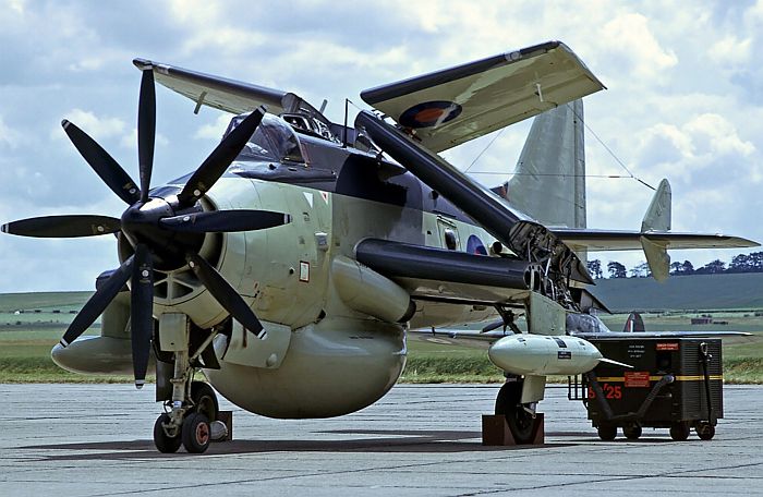 配合CVA-01艦隊航空母艦而規劃的搪鵝AEW7預警機,改用機背圓盤雷達。 隨著工黨政府取消CVA-0並放棄艦隊型航空母艦,搪鵝AEW7只停留在紙面上 塘鵝式(Gannet)螺旋槳機:由法利飛機公司(Fairey Aviation Company)生產,1949年9月19日首度飛行,1953年服役,機首配備一具阿姆斯壯.賽德利(Armstrong Siddeley)公司的Double Mamba ASMD同軸反轉渦輪螺旋槳發動機。塘鵝有多種衍生機型,產量最大的AS.1/4/6是反潛型,AEW3是空中預警型,機腹裝置一具美製AN/APS-20F搜索雷達(原本裝在英國1951年從美國購買的AD-4W天襲者預警機,AD-4W除役後拆除雷達裝到塘鵝預警機上),此外還有ECM.6電子反制型、COD.4人員/貨物運輸型以及T.2/5教練型。除了英國之外,塘鵝也被西德、澳洲、印尼採用 。 塘鵝最主要的反潛構型在1960年代中期就從皇家海軍除役,被反潛直昇機取代;繼續服役的機體主要作為航空母艦上的預警機型和運輸機型,在皇家海軍服役到1978年年底皇家方舟號航空母艦除役為止。而塘鵝AEW3預警機上的AN/APS-20F又拆到皇家空軍沙克爾頓(Avro Shackleton)反潜機上,稱為沙克爾頓MR2,使用到1980年代末期。 在1960年代,皇家海軍配合當時規劃的CVA-01艦隊航空母艦,也曾計畫發展新一代的塘鵝AEW7預警機,以一部安裝在機背的圓盤雷達(類似美國E-1與E-2艦載預警機)取代原本的AN/APS-20F機腹雷達,擁有更好的全向搜索能力。不過隨著工黨政府取消CVA-01並決定退役所有艦隊型航空母艦,塘鵝AEW7就僅僅停留在紙面上。 塘鵝式配置三名人員,全長13m,翼展16.56m,高4.19m,空重6835kg,配備一具Armstrong Siddeley的Double Mamba ASMD渦輪螺旋槳發動機,輸出2950軸馬力,最大平飛速率500km/hr,升限7600m,能持續飛行5至6小時,機上可籌攜帶2000磅的炸彈、魚雷、深水炸彈或無導引火箭等。