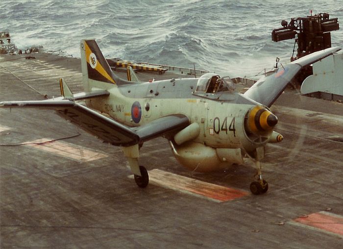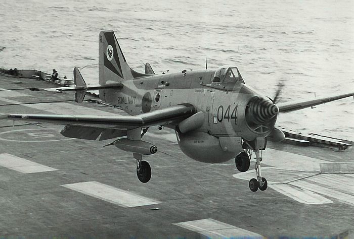 (上與下)降落在皇家方舟號上的塘鵝(Gannet)AEW3預警機。