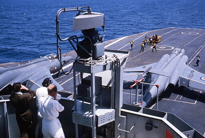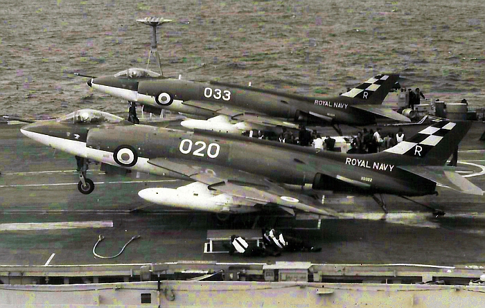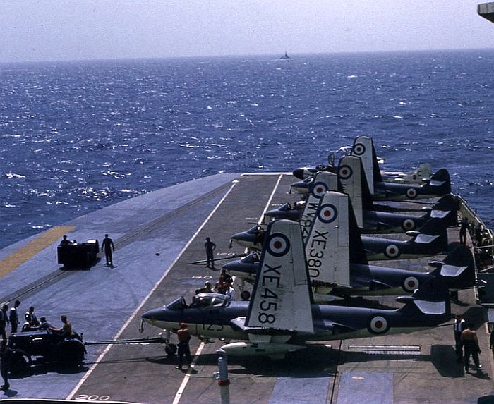 兩架屬於皇家海軍809艦載機中隊(809 NAS)的加勒比海盜在競技神號(HMS Hermes R12)甲板前端準備起飛。