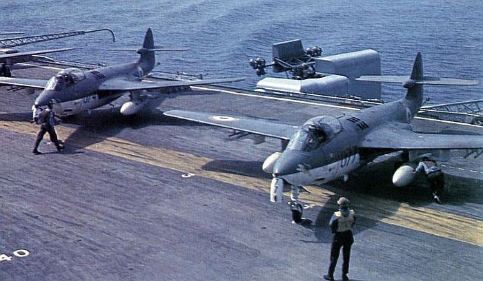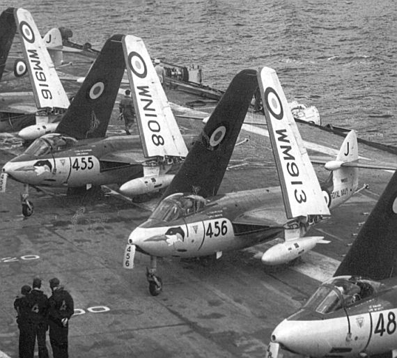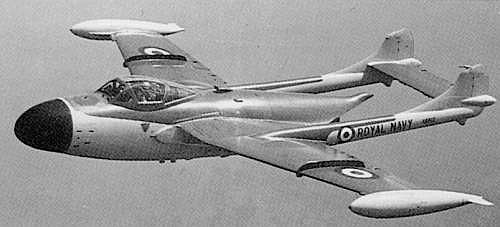 海毒式噴射艦載攻擊機。 DH.112海毒式(Sea Venom)雙座噴射戰鬥機:由哈維蘭公司(de Havilland)生產,是空軍DH.110毒式(Venom)系列中NF.2雙座夜間戰鬥機的海軍版,原型機1949年9月2日首次飛行。 毒式是哈維蘭公司先前吸血鬼(DH.100 Vampire)型的改良型號,沿用吸血鬼的雙尾椼(twin-boom)設計與梯型機翼,換裝推力更大的發動機Goblin103/104/105渦輪噴射發動機,飛行速率超過600英里/小時,先後有FAW.20、FAW.21、FAW.22等次型進入皇家海軍服役。海毒式亦曾外銷多個國家,在 皇家海軍服役到1950年代末期被海雌狐取代。