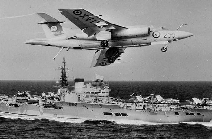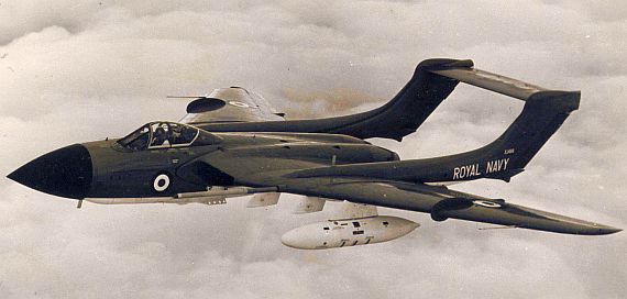 一架NAS889中隊的海雌狐戰機正在發射火箭 海雌狐(Sea Vixen)DH.110雙座噴射戰鬥機:由哈維蘭公司(de Havilland)生產,是海毒式的後繼型號 ,原型機於1951年9月26首度進行試飛,1959年7月服役,先後有FAW.1與FAW.2兩種型號,皇家海軍總共訂購了145架。海雌狐繼續沿用吸血鬼、毒式以來的雙尾椼設計,不過改採更先進的後掠翼與雙發動機。海雌狐是皇家海軍第一種採用後掠翼、不裝備固定機槍砲而單純仰賴空對空飛彈的戰鬥機,也是哈維蘭公司生產的最後一種戰鬥機。海雌狐在 皇家海軍服役到1972年左右除役。 以海雌狐FAW.2為例,其全長16.94m,翼展15.54m,機高3.28m,空重12680kg,籌載重量18860kg,最大起飛重量21205kg,裝備兩具Rolls-Royce Avon Mk.208渦輪噴射發動機,每具推力各11000磅(50kN),最大平飛速率約0.91馬赫,相當於每小時1110公里(時速690英里),航程1270km,生限15000m,爬升率46m/s;武裝方面,機上有六個掛載點,可攜帶四個Matra SNEB 68mm 18聯裝火箭夾艙,或四枚火光(Firestreak)/紅頂(Red Top)空對空飛彈;此外,也可攜帶一枚紅鬍(Red Beard)核子炸彈,進行戰術核武投擲任務。