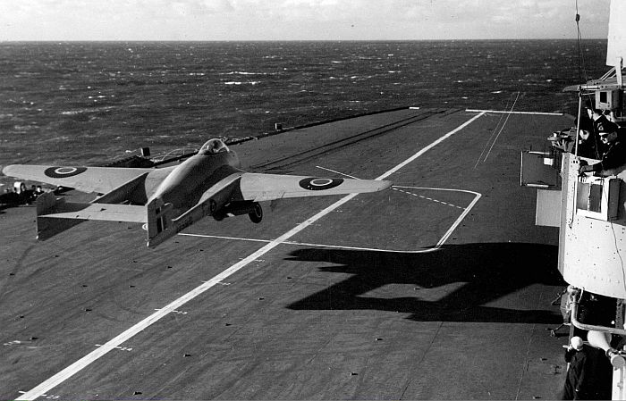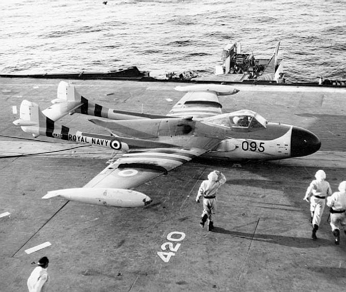 吸血鬼噴射戰機首次在 巨像級的海洋號(HMS Ocean R68)降落著艦,