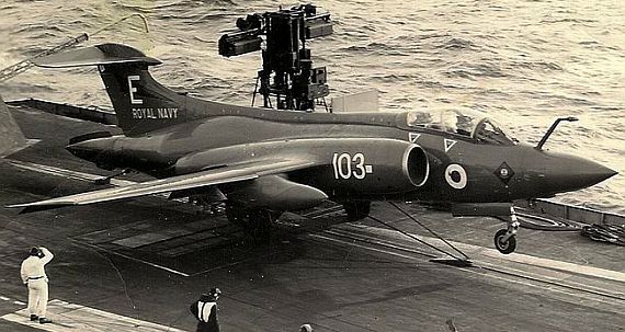 彎刀式噴射艦載攻擊機。 彎刀式(Scimitar)單座噴射攻擊機:由超級馬林(Supermarine)公司研發;此計畫最先源於Type 505設計,當時使用水平主翼與V型尾翼。在1948年,修改的Type 508推出,並在1951年8月31日首次試飛,並在1952年5月於鷹號(HMS Eagle R05)上進行起降測試。接下來進一步修改的Type 529在1952年8月29日首次試飛,加裝了一個機尾雷達;Type 508/529可以達到大約每小時607英里的速率;接下來推出的Type 525改用後掠翼降低阻力,並增加降落時使用的減速板,1954年4月27日首次試飛,後來意外失事。以Type 525為基礎,修改後的預量產型Type 544隨後推出,於1956年1月19日首次試飛,彎刀式的設計就此定案。 第一架量產型彎刀式於1957年1月11日首次試飛,隨後就進入皇家海軍服役,總共生產76架,1969年除役 。最初彎刀式打算作為一種超音速戰鬥機,但後並沒有達到這個目標,只能次音速飛行, 服役後被皇家海軍當作攻擊機使用。此外,彎刀也是皇家海軍第一種能掛載核子武器升空的艦載機,帳面上讓皇家海軍航空母艦首度擁有核子攻擊能力;然而,實際上整個服役期間都沒有掛載過核子武器,這是因為以彎刀的性能,要攜帶沈重的核子彈返航降落實在太過勉強,而昂貴又危險的核子武器更不可能在降落前拋海。由於重量較大,彎刀式在英國鷹號、皇家方舟號以外的輕型航空母艦上操作都比較危險,服役期間折損高達39架。彎刀式在1960年代末期逐漸被新的 加勒比海盜(Buccaneer)式取代。 彎刀式全長16.84m,翼展11.33m,機高5.28m,空重10864kg,籌載重量15513kg,配備兩具勞斯萊斯Avon Mk.202/208渦輪噴射發動機,每具推力11250磅(50.1kN),最大速率1185km/hr(每小時736英里),航程2289km,升限14000m,固定武裝為四門ADEN 30mm機砲,有四個掛架,可掛載四枚1000磅(454kg)炸彈,或至多16枚二吋或三吋無導引火箭,或四枚AGM-12犢牛(Bullpup)/AIM-9響尾蛇( Sidewinder)空對空飛彈,或一枚紅鬍(Red Beard)核子炸彈(當量相當於15~25Kton級黃色炸藥)等 。 由於彎刀式重量較大,為了能在較短的皇家海軍彈射器起飛,在彈射器上以鋼纜固定時會將機尾拉下,使機頭仰起(鼻輪離地)獲得攻角,增加彈射時的升力。