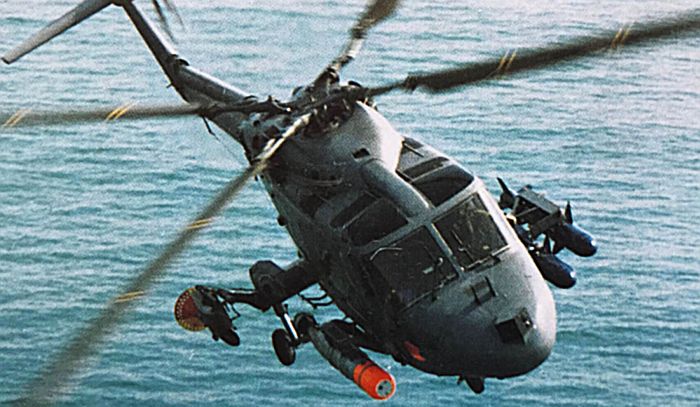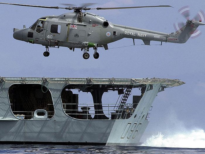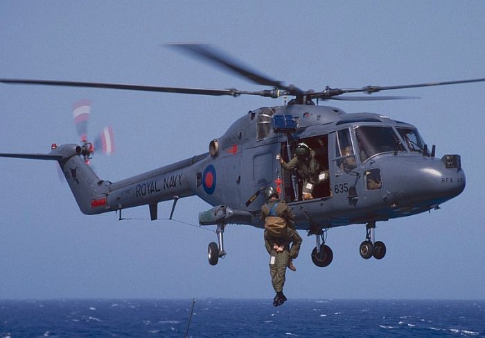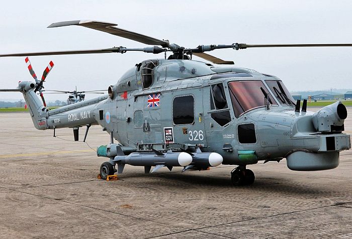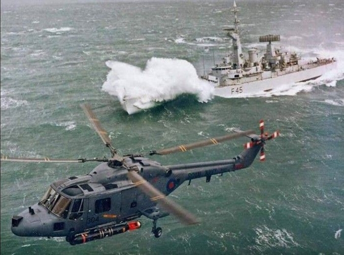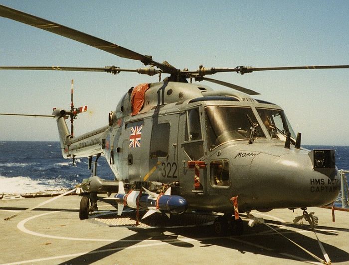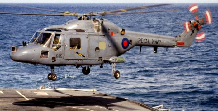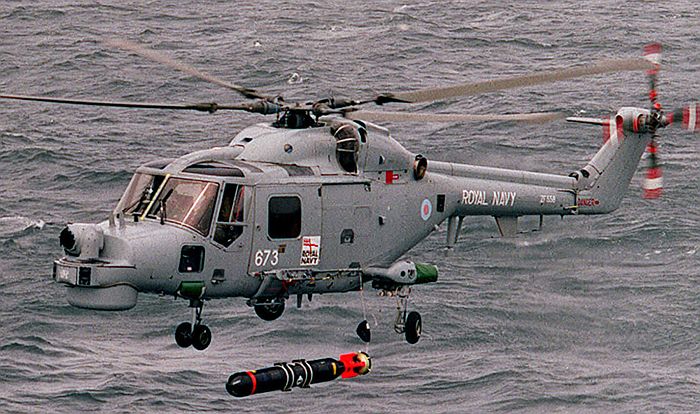 一架皇家海軍的大山貓HAS.2反潛直昇機,機體左側掛架掛載一枚魟魚(Sting Ray)魚雷,其後有一個