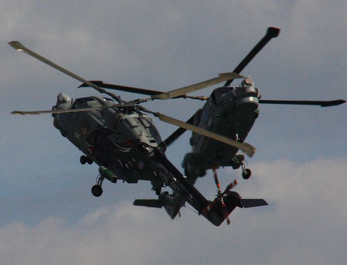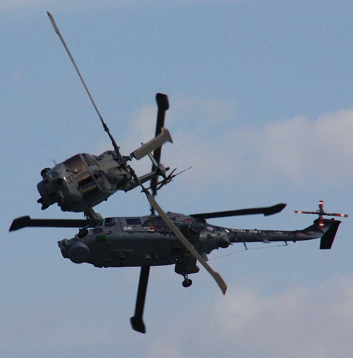 (上與下二張)皇家海軍黑貓表演隊的大山貓HAS.8反潛直昇機的雙機表演。